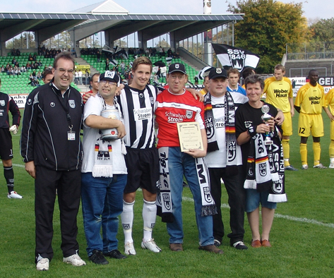 und Elke Neumann, alle vom Fanclub Spatzen-Express,